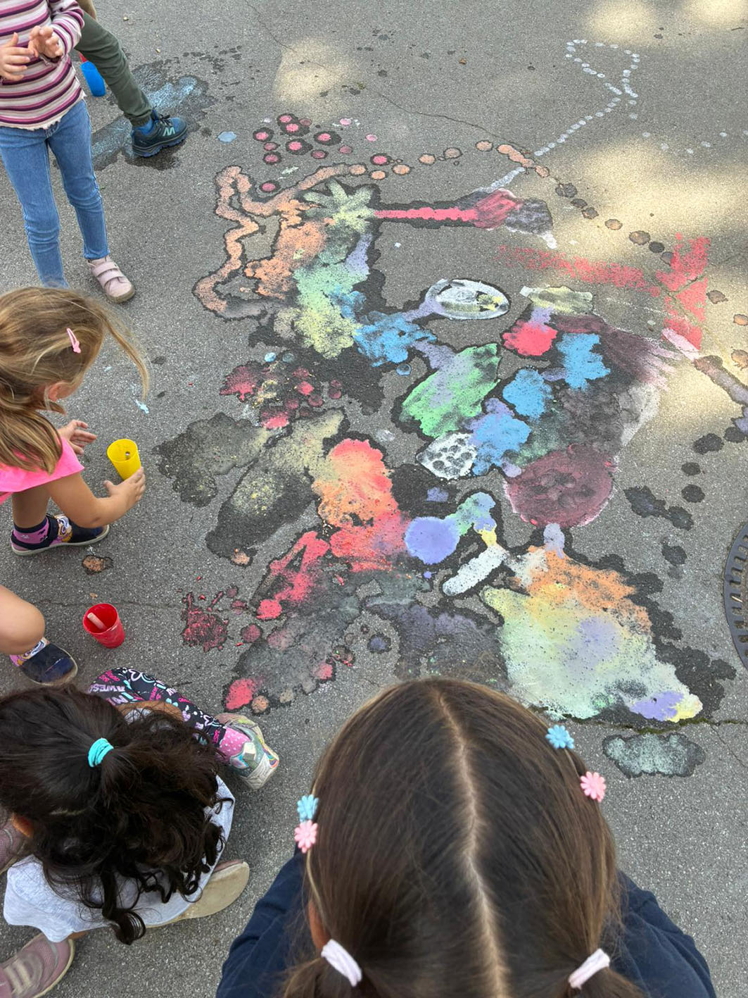 So werden auf dem Schulhof selbstgemachte Kreidefarben ausprobiert, mit denen die Kinder bunte Bilder und Muster gestalten. Bei sportlichen und selbstgebastelten Spielen wie dem Kastanienweitwurf oder dem Eierlauf kommt es auf Geschicklichkeit, Ausdauer und Teamgeist an – und der Spaß steht dabei immer im Vordergrund.