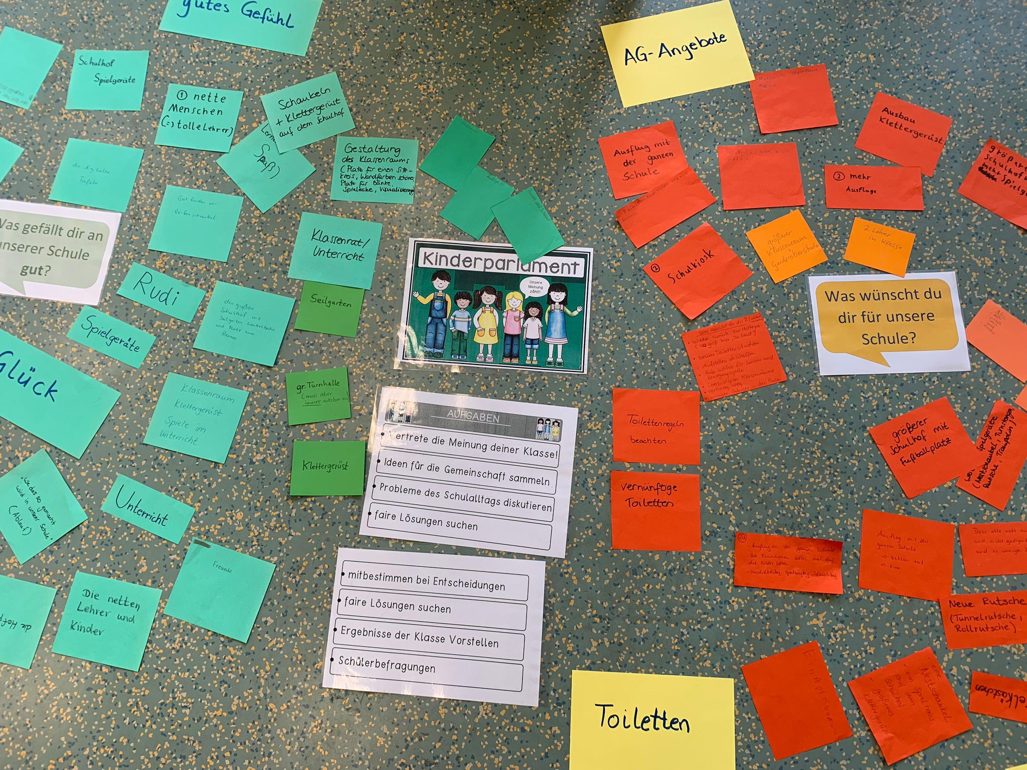Gemeinsam stellten wir fest, was uns an unserer Schule gut gefällt und sammelten darüber hinaus viele tolle Ideen für Dinge, die wir uns an unserer Schule noch wünschen.