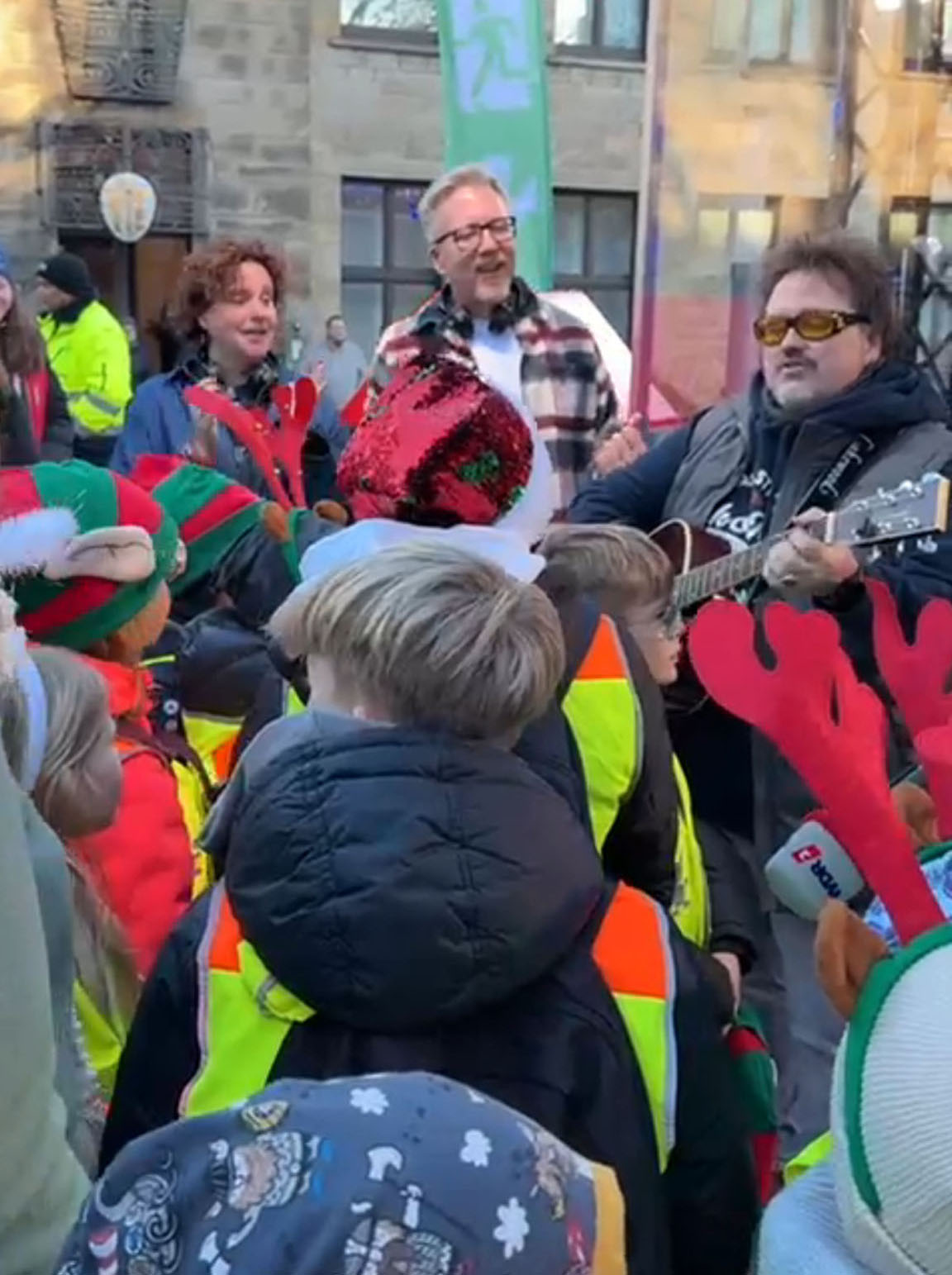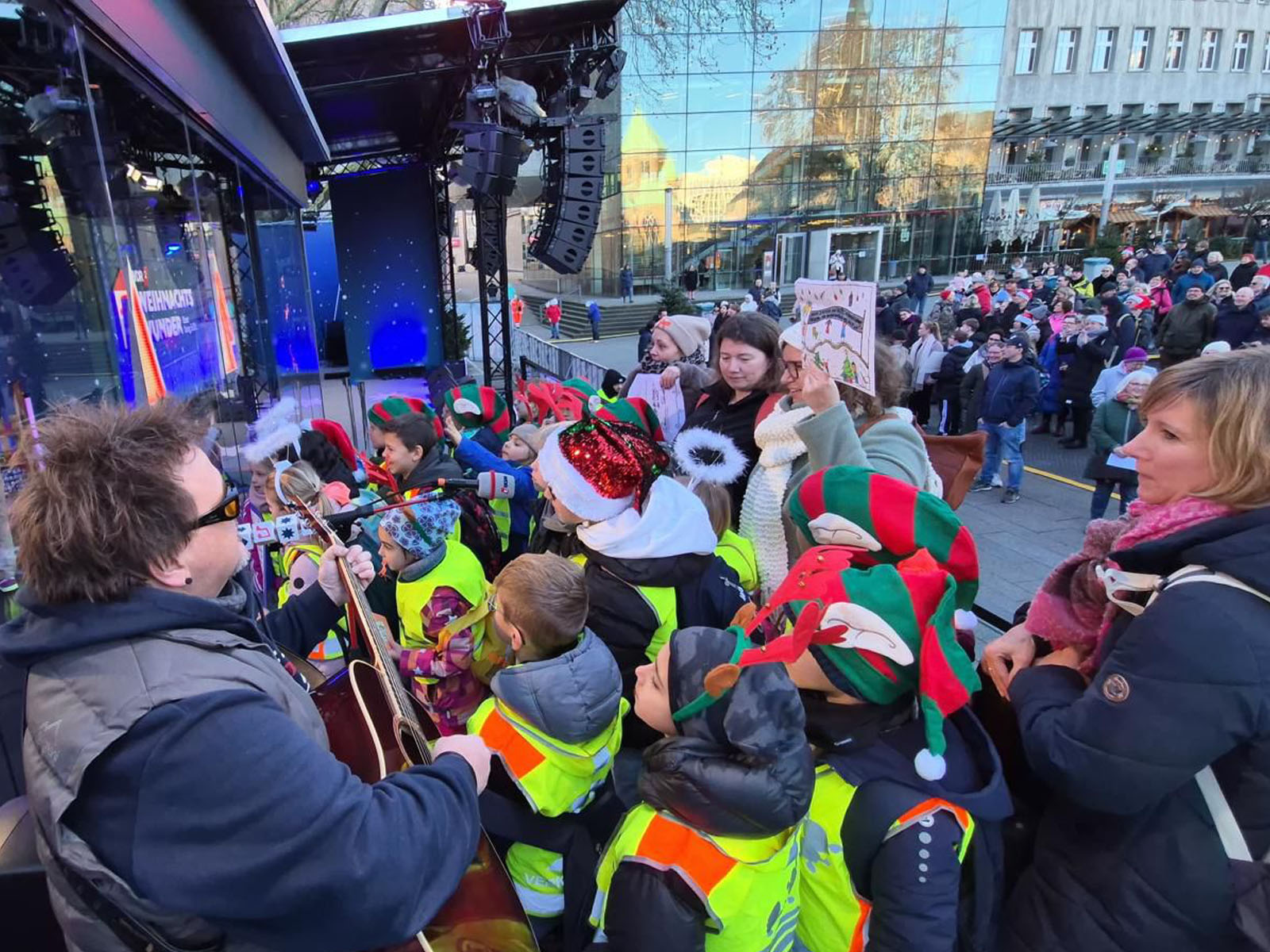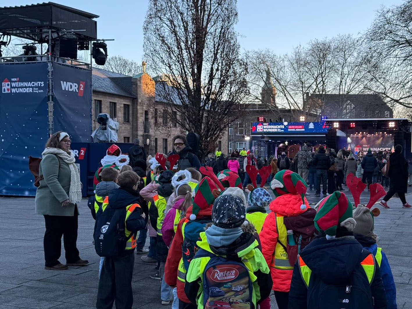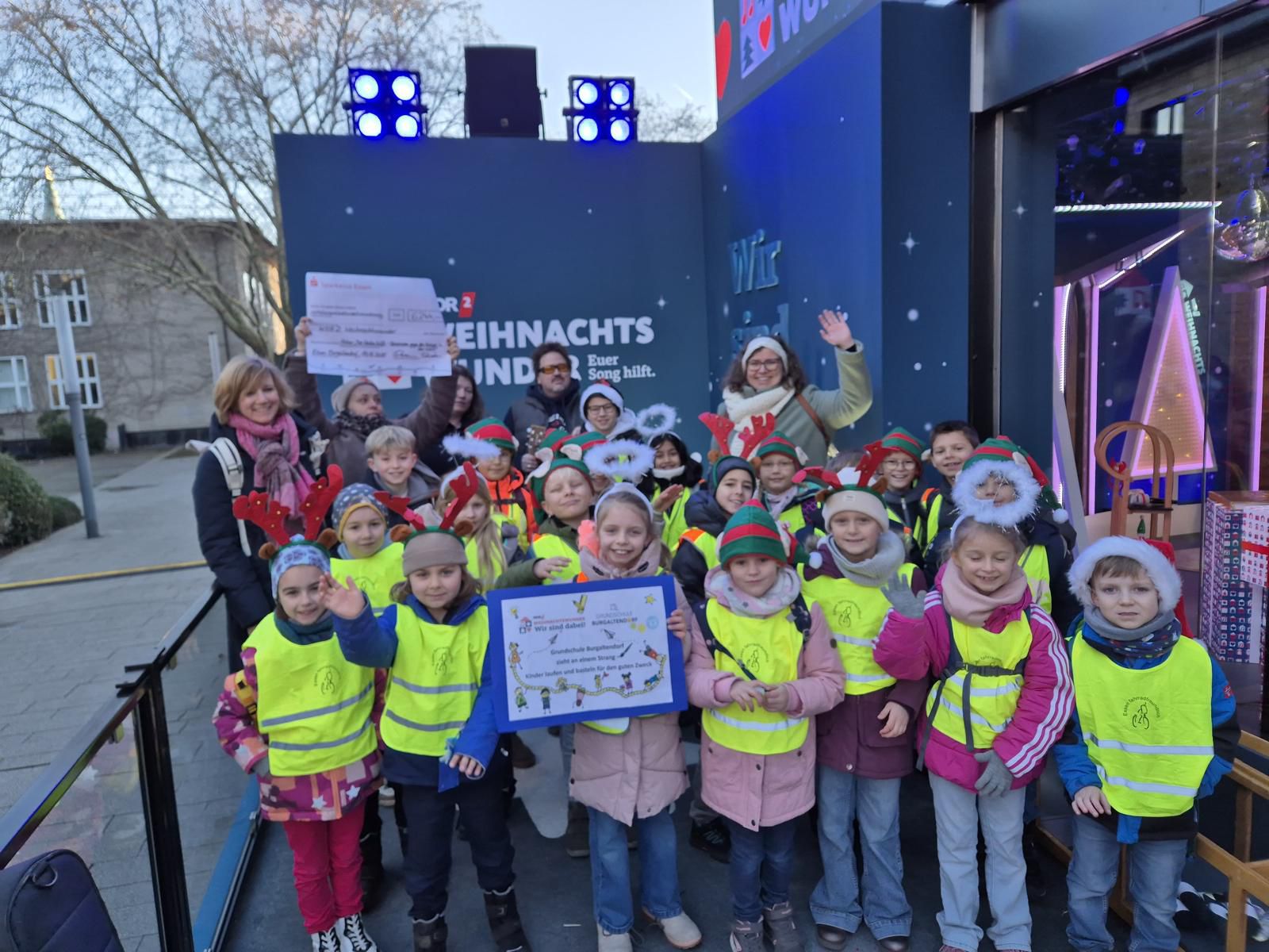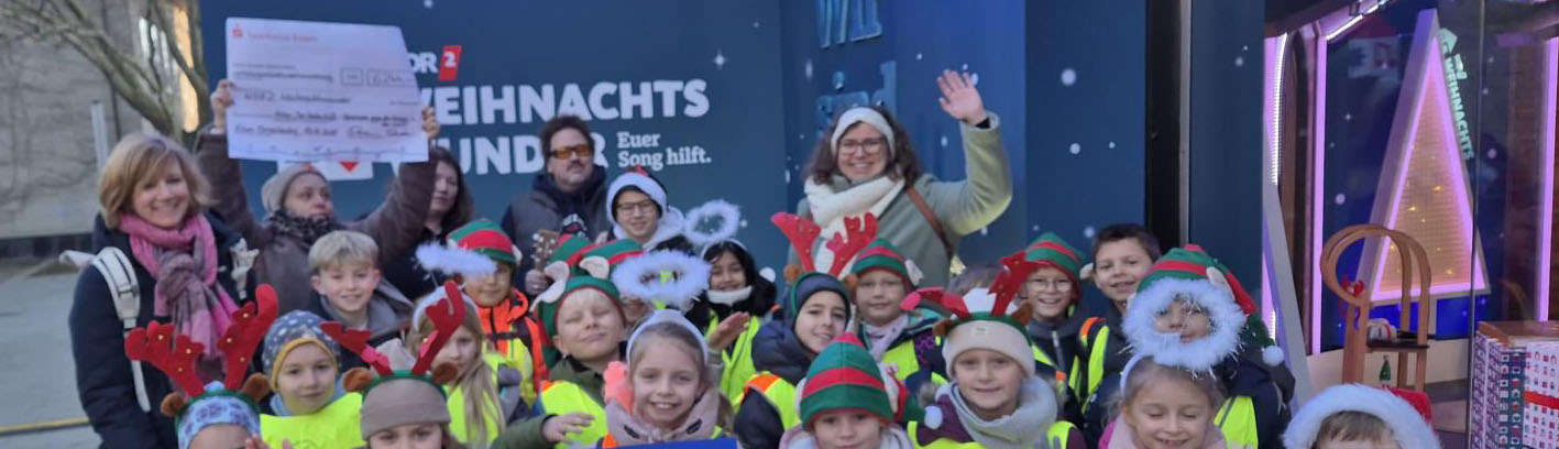 Am Montag, den 15. Dezember, war es dann so weit: Die Kinder unseres Kinderparlaments, unsere Schulleitung Frau Pentek und Frau Herberg als Leitungen des Kinderparlaments, unser Musiklehrer Herr Reich als musikalische Unterstützung sowie Mitglieder des Fördervereins machten sich auf den Weg in die Essener Innenstadt zum Burgplatz. Dort übergaben sie persönlich die stolze Summe von über 6.000 Euro an das WDR2-Weihnachtswunder. Für alle Beteiligten war das ein aufregender Moment – das Event wurde live im Fernsehen und per Livestream übertragen.