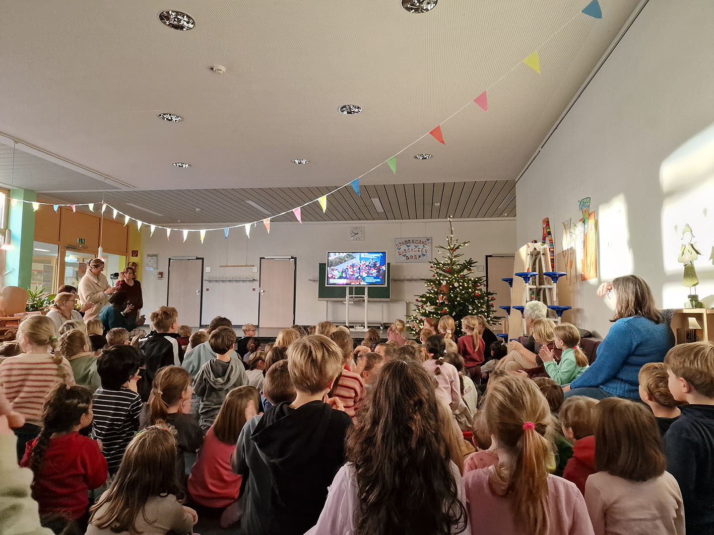 Und das Beste: Auch die Kinder in unserer Schule konnten das Geschehen live miterleben. An unseren digitalen Tafeln verfolgten sie gespannt, wie ihr Engagement und ihre Mühen beim Sponsorenlauf einen echten Unterschied machen. Jubel, Freude und stolze Gesichter begleiteten die Übergabe – ein unvergesslicher Moment für unsere Schule!